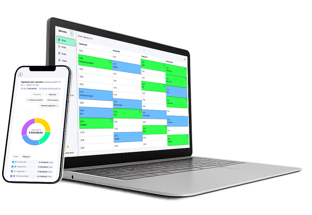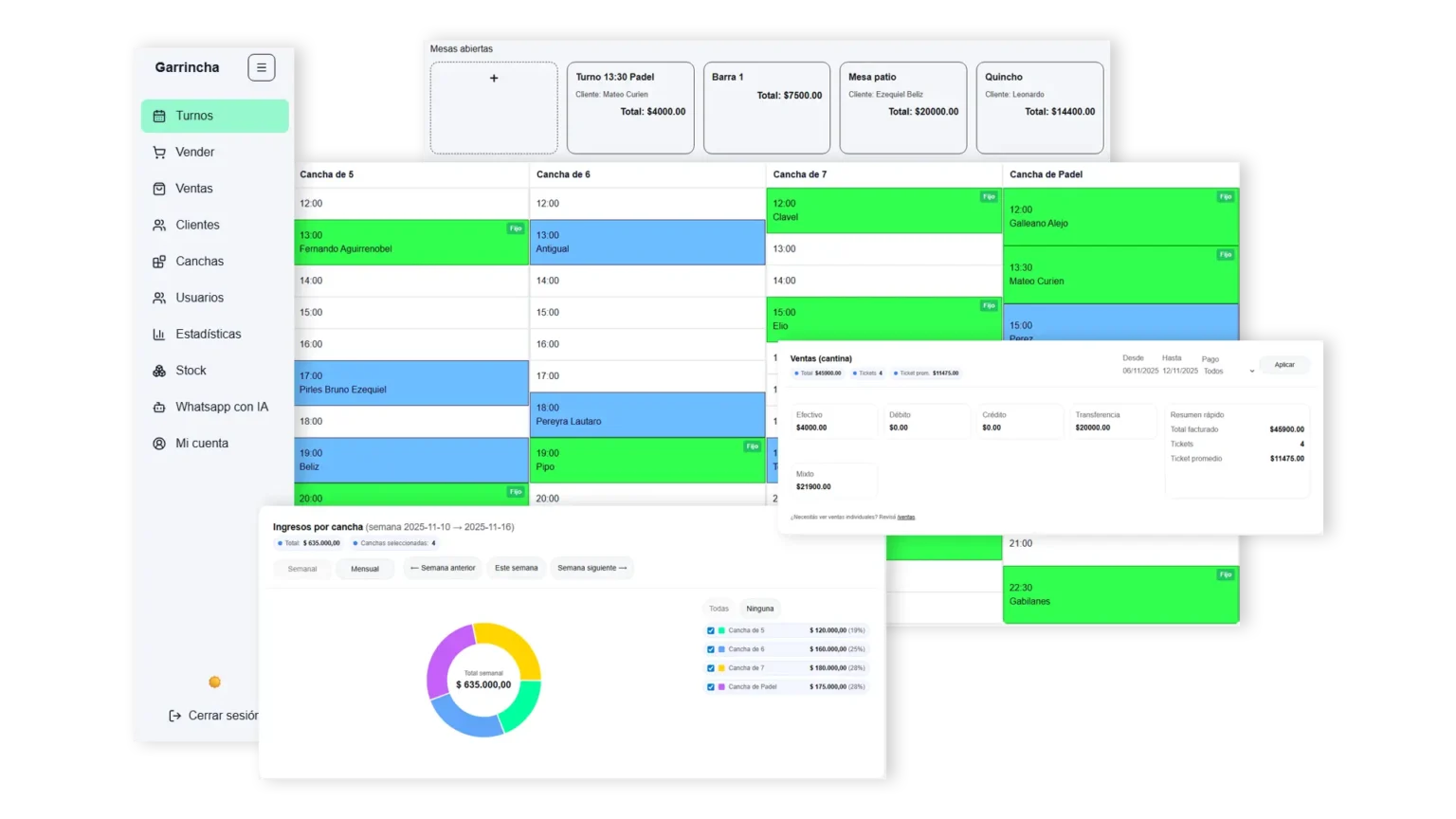 Garrincha se encarga de mostrarte todo en su sistema: qué cancha está ocupada, qué turno está libre, cuánto facturaste y qué queda por cobrar.